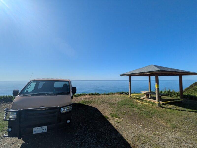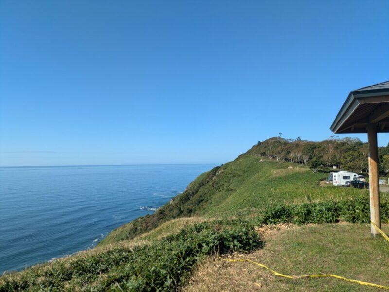 来止臥野営場は太平洋に面した断崖絶壁の上にある野営場で、遮るものがないので抜群のロケーションですが、反面、風が強い所でもあります。